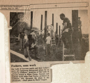 Another fond memory is when the OLS community came together to build “Fort Taylor” in one day. What started with a set of drawings, more lumber, chains and tires than I had ever seen (and a bunch of telephone poles that our Dad had everything to do with but never mentioned once), were raised into the coolest play structure ever. Everyone played a role and found a way to be useful throughout the day. We kept finding the most random objects as we were working on land that was once part of the WP dump. The architect, Paul Taylor, was awarded a bowling ball that was unearthed while digging one of the holes. Coming together as volunteers for a project benefiting the greater good exemplified that it is in giving that we truly receive. I try to bring that spirit of collaboration and camaraderie to my community and parish here in Atlanta.